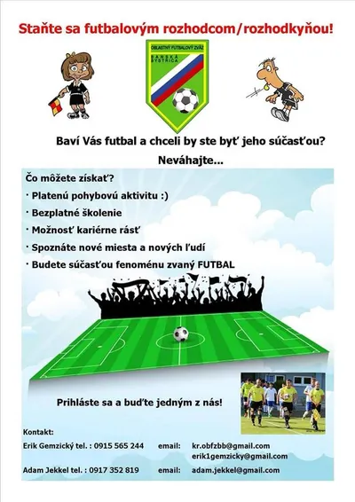 „Hľadáme študentov, aktívnych, ale aj bývalých futbalistov, ktorých baví šport a majú chuť stať sa futbalovými rozhodcami. Všetkým záujemcom zabezpečíme bezplatné vstupné školenie, ktoré bude začiatkom augusta. Po absolvovaní kurzu dostanú potrebnú výstroj,“ hovorí aktívny ligový rozhodca Erik Gemzický, predseda Komisie rozhodcov Oblastného futbalového zväzu Banská Bystrica.