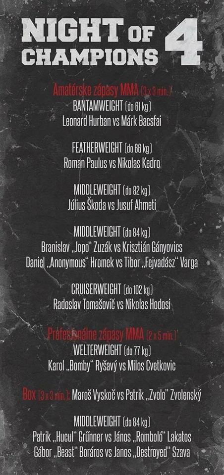 Už tento piatok sa priaznivci bojových športov môžu tešiť na podujatie Night of Champions 4, ktoré už tradične ponúkne vystúpenia prevažne domácich bojovníkov. Okrem piatich amatérskych a troch profi duelov podľa pravidiel MMA, sa do klietky postavia aj boxeri, ktorí pripravia obecenstvo na to najlepšie, čo turnaj ponúkne.