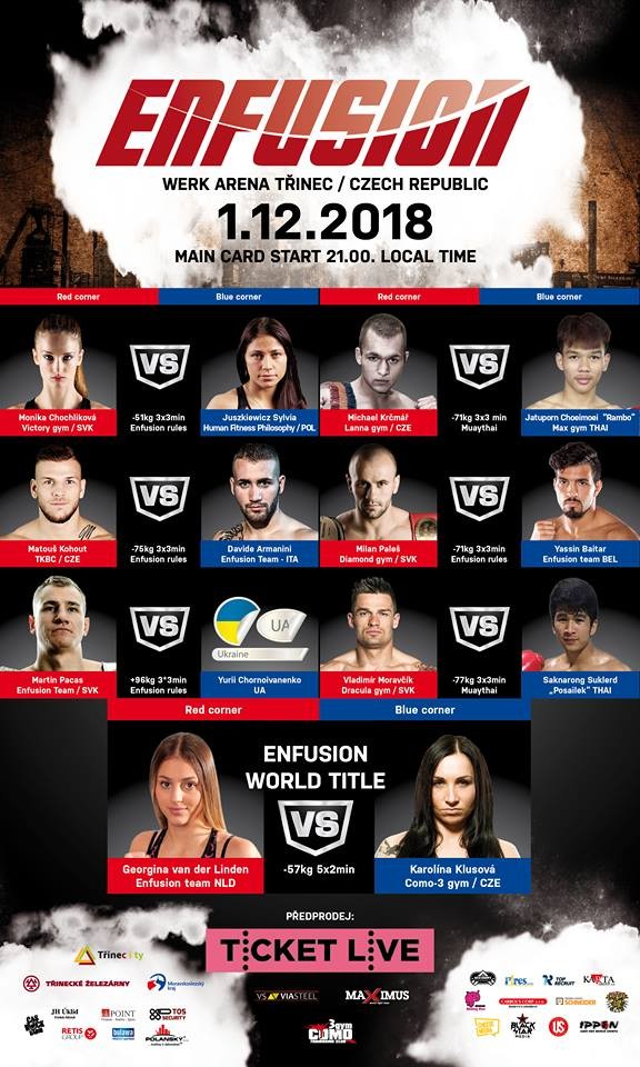V ženských zápasoch sa predstavi Monika Chochlíková, ktorá bude čeliť Poľke Sylvii Juskiewicz (Ktorá napríklad zápasila s Joanou Jedrzejczyk) a Karolína Klusová, ktorá bude bojovať o svetový titul ENFUSION s holadnskou hviezdou van der Linden!