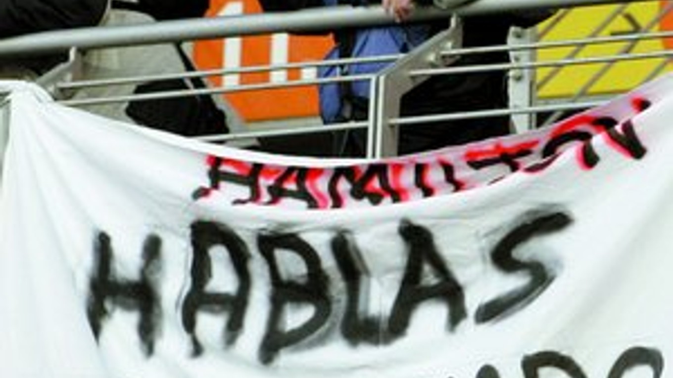 Hamiltona minulý týždeň pri testovacích jazdách McLarenu na okruhu Catalunya pri Barcelone urážali, na prvého pretekára tmavej pleti v histórii F1 vykrikovali z hľadiska rasistické heslá. Na jednom z transparentov si mohol prečítať, že je „veľkohubý“ (snímka SITA/AP).