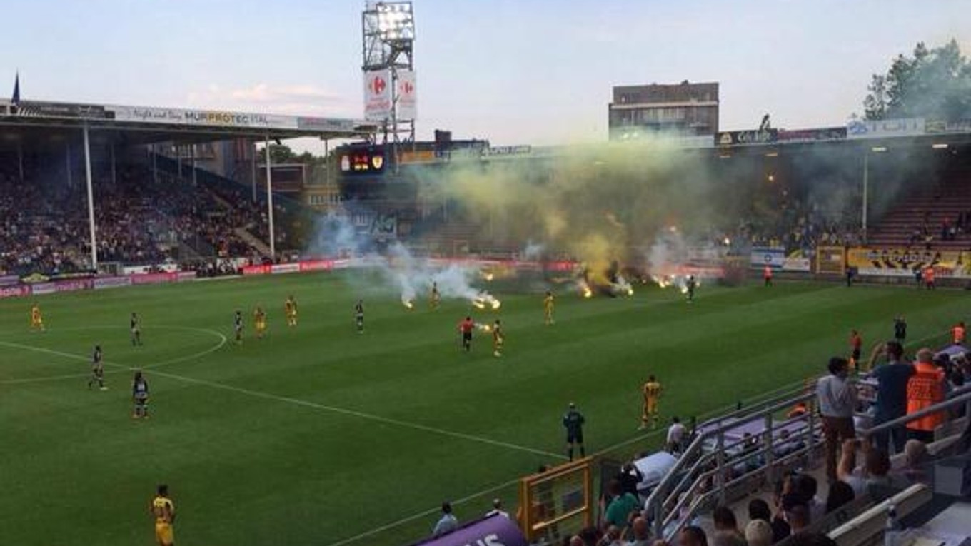 Priaznivci po štvrtkovom zápase 2. predkola Európskej ligy UEFA 2015/2016 na pôde belgického Charleroi zahádzali hraciu plochu svetlicami, dymovnicami a ďalšou pyrotechnikou.