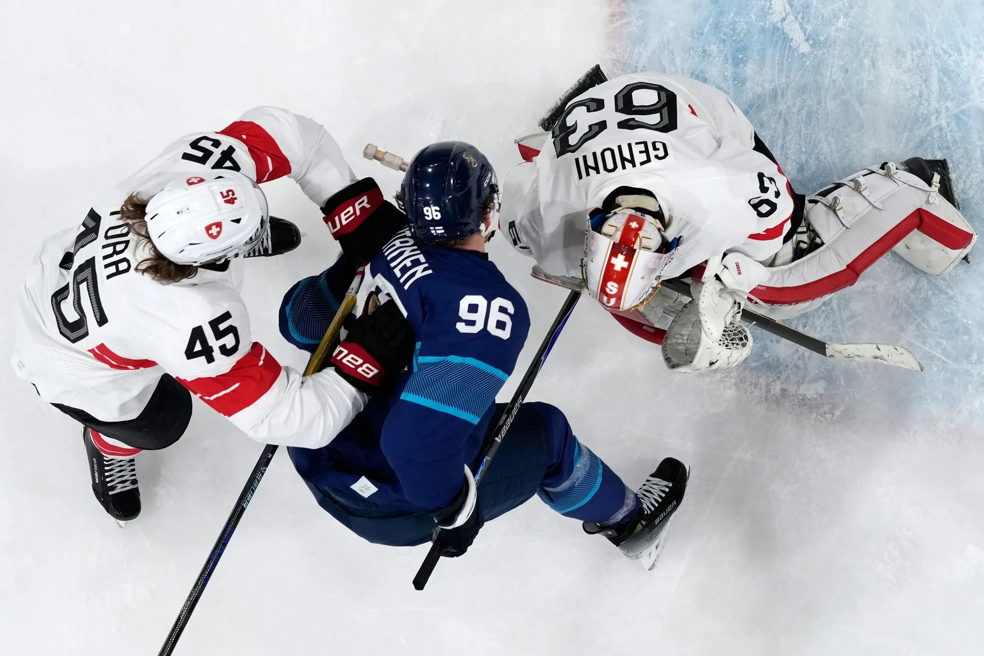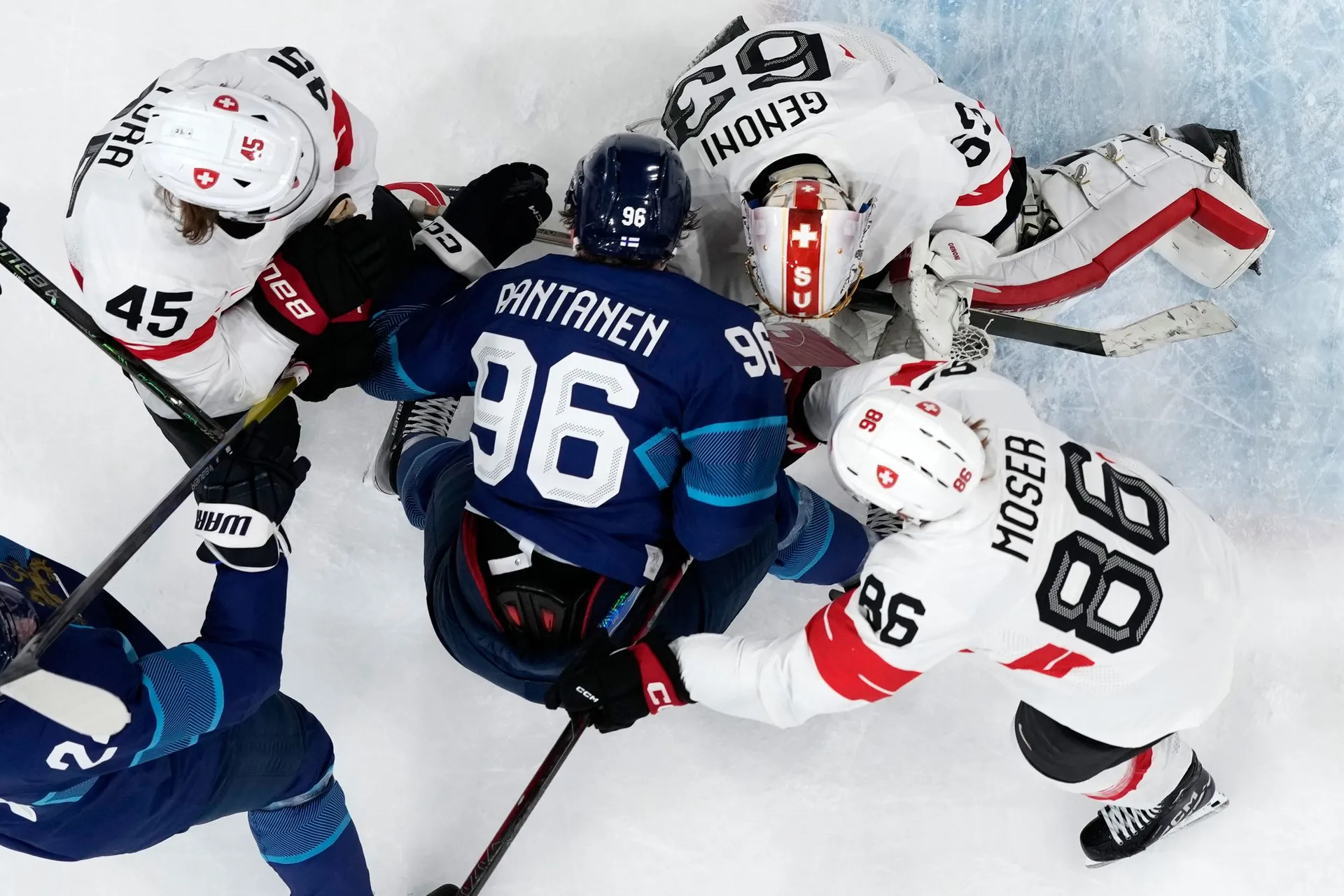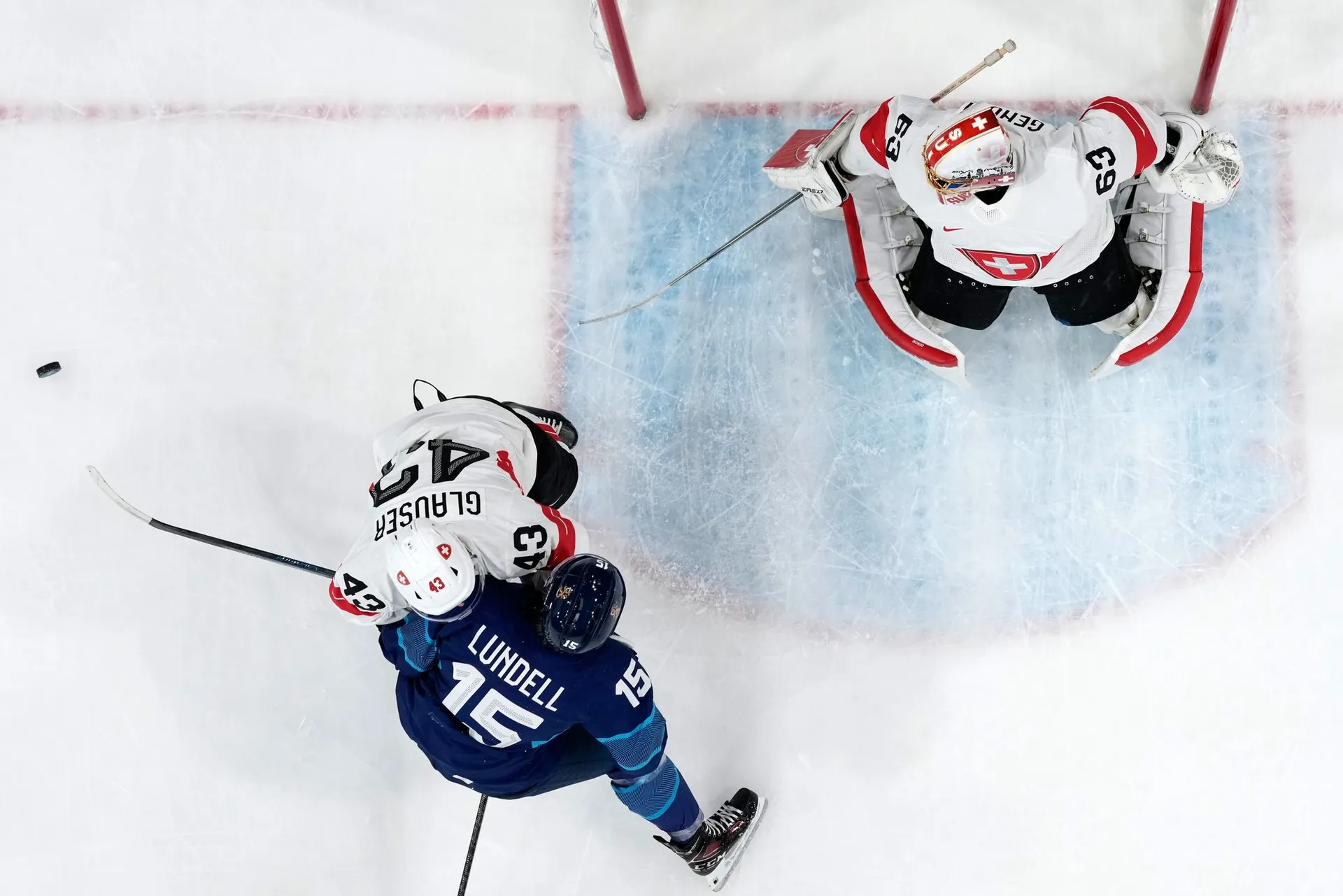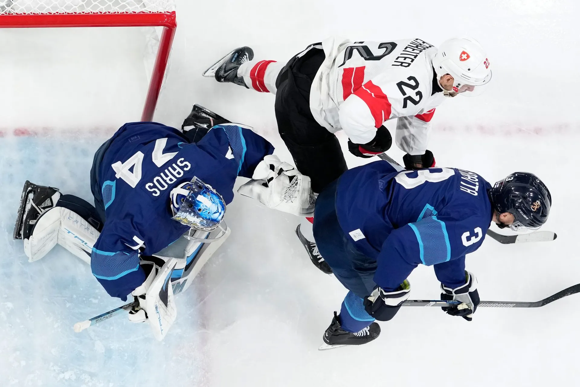Obrovská chyba Sarosa viedla k otváraciemu gólu Švajčiarska. Fínsky brankár si išiel po puk, no prvý bol pri ňom Jäger, ktorý prihral DAMIENO RIATOVI, ktorý do odkrytej bránky otvára skóre.