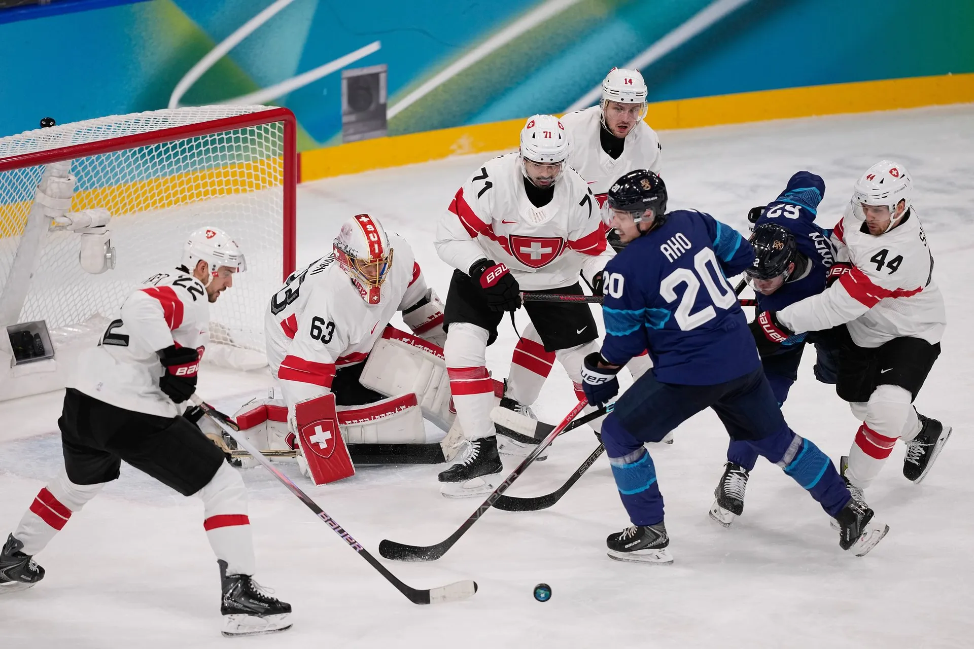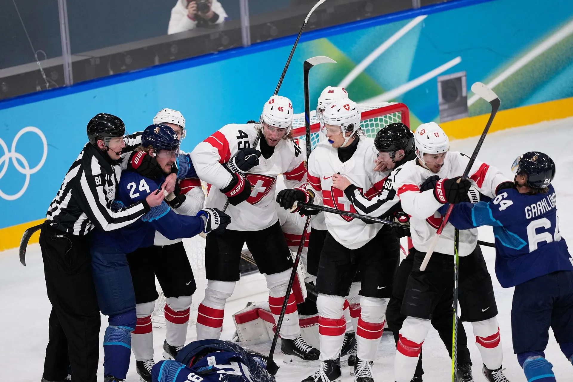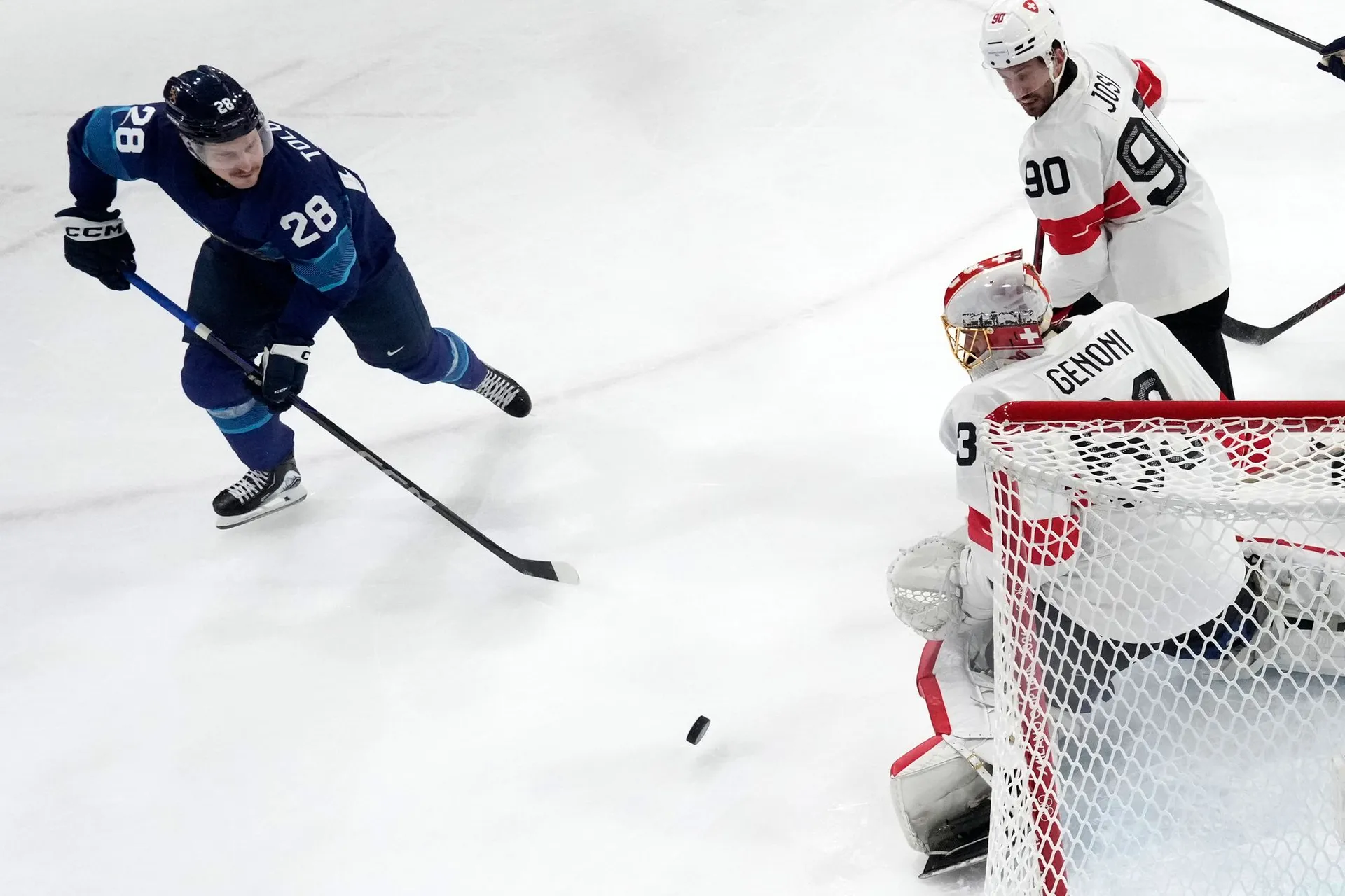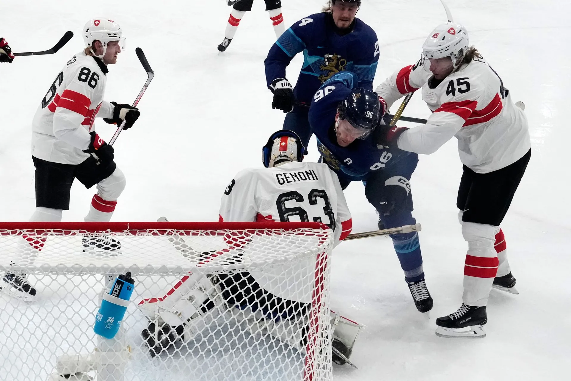 Švajčiarsku sa podarilo v náročnej skupine obsadiť druhé miesto len za hviezdnou Kanadou a v osemfinále si bez problémov poradili s domácim Talianskom, čo ich priviedlo do tohto štvrťfinálového súboja so Suomi.