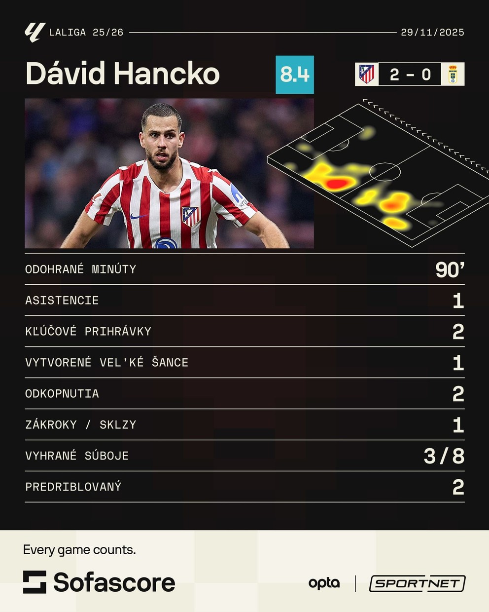 Atlético Madrid v zápase 14. kola La Ligy zdolalo doma Real Ovieda 2:0, keď dvakrát skóroval nórsky útočník Alexander Sørloth. Zásadný podiel na oboch góloch však mal práve Hancko.