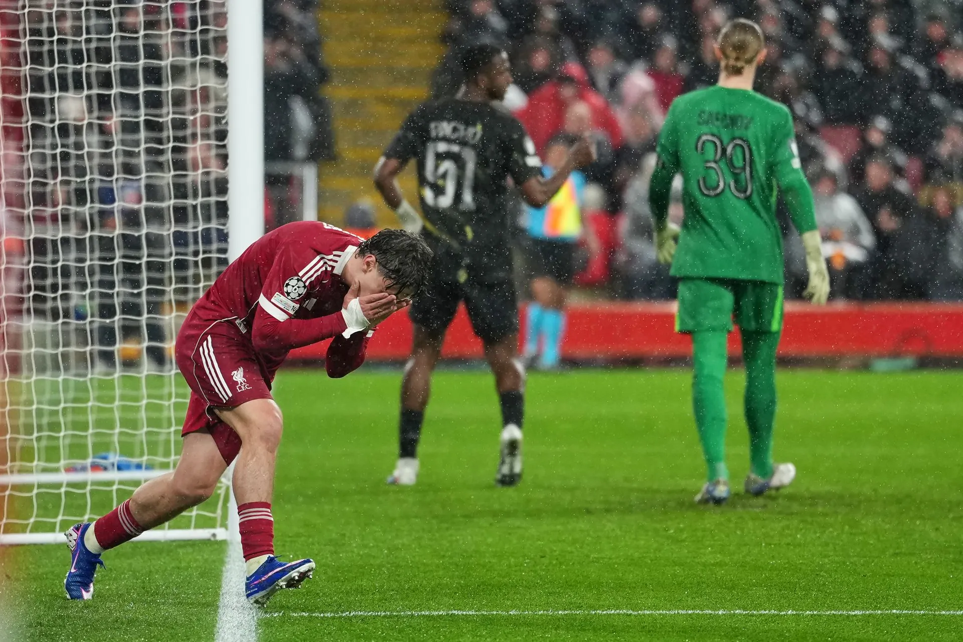 Zo sľubnej pozície v šestnástke zakončoval Gravenberch po zemi do stredu brány, no Safonov predviedol spoľahlivý zákrok a loptu chytil.
