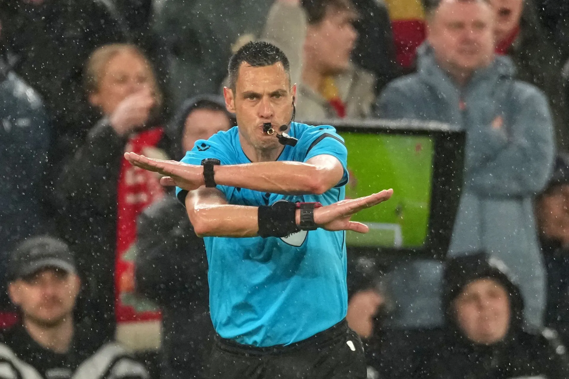 Po tvrdom zákroku Frimponga rozhodca Mariani okamžite prerušuje hru a píska faul.