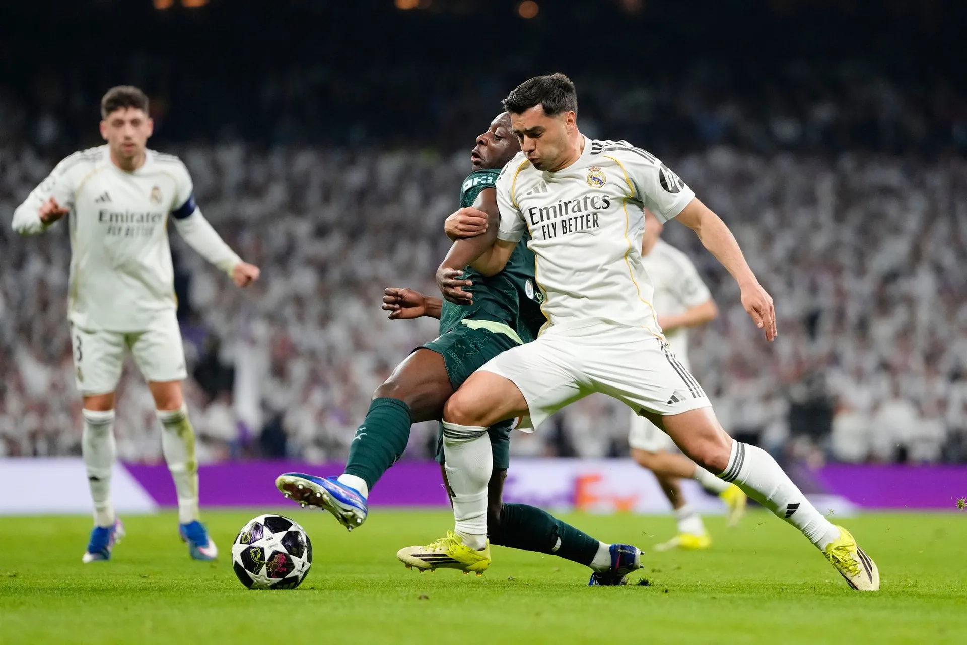 rda Guler skúšal z ľavej strany poslať prudkú prihrávku na malé vápno, ale loptu dokázal zablokovať Guéhi.