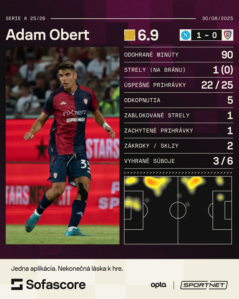V drese Cagliari odohral celý zápas Adam Obert. Tentoraz nehral stopéra, tréner s ním mal iné plány. Naskočil na poste krajného obrancu, čí krídla.