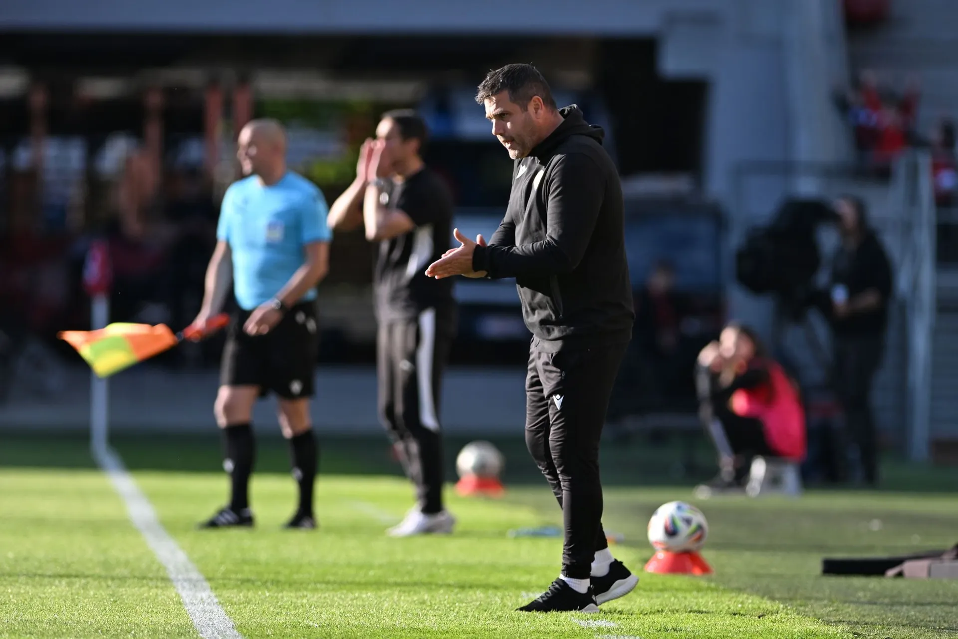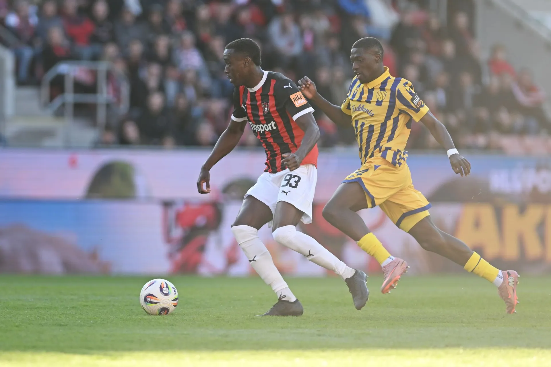 Polovica hracej plochy je pod tieňom, na zvyšnú časť ešte svieti slnko. Určite to nie je jednoduché ani pre samotných aktérov. Kapitán domácich Sabo neprihral presne na Koštrnu.