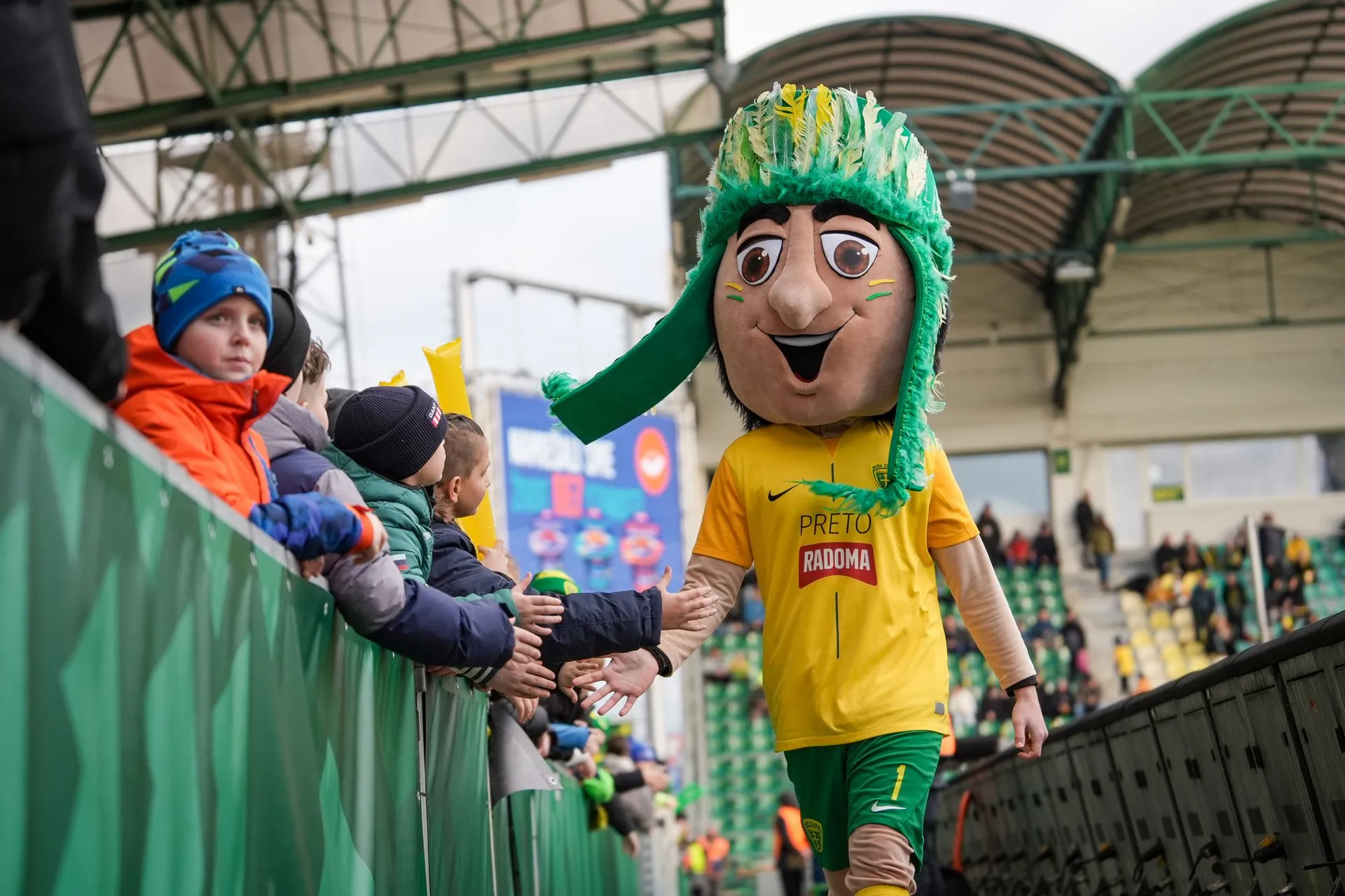 Pred zápasom znovu nechýbalo trefné choreo, tentoraz bol na ňom mladý hráč, ktorému z úst trčali belgické hranolky.