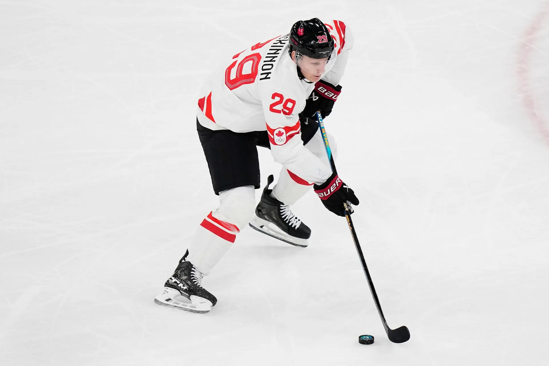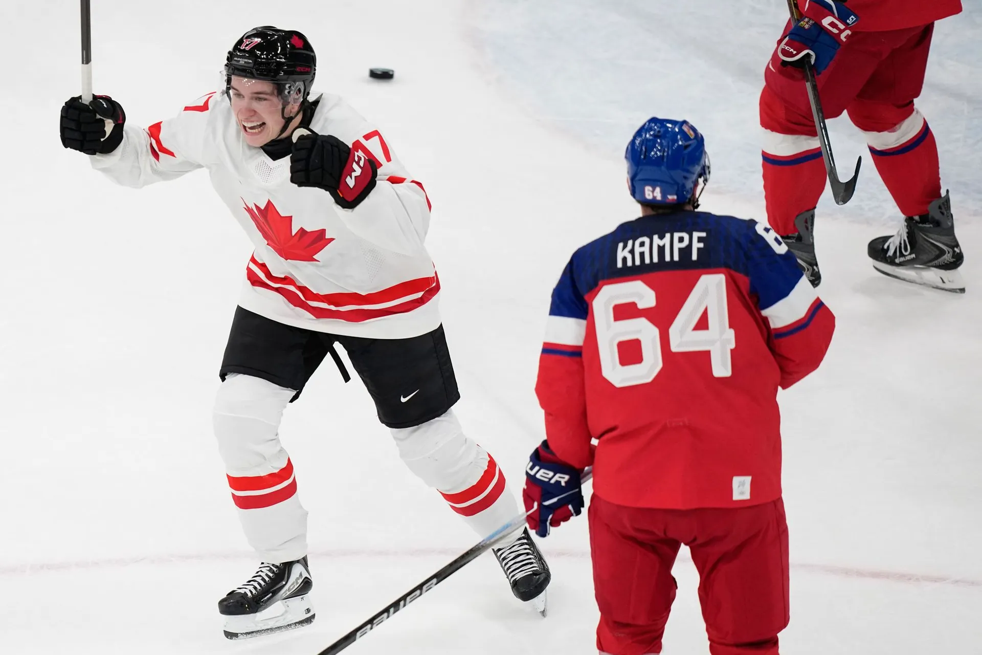 Zlom však prišiel tesne pred prestávkou. Šesť sekúnd pred koncom prvej tretiny tečoval najmladší hráč v zostave 19-ročný Macklin Celebrini strelu Calea Makara a Kanada viedla 1:0.