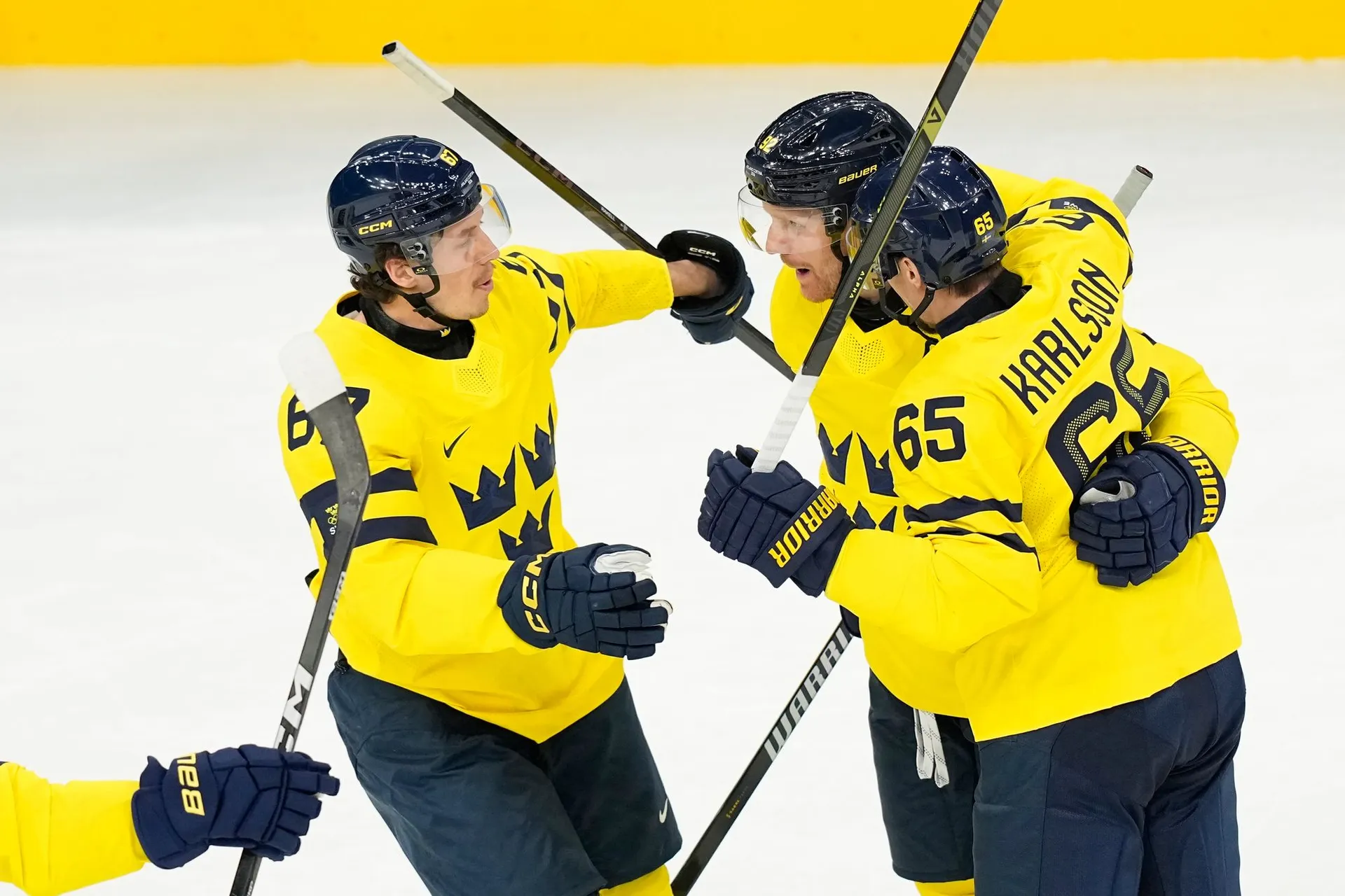 Švédsko: Gustavsson – Karlsson, Broberg, Dahlin, Forsling, Andersson, Hedman, Ekman-Larsson – Nylander, Eriksson Ek, Kempe – Raymond, Lindholm, Bratt – Zibanejad, E. Pettersson, Rakell – Landeskog, Wennberg, Holmberg – Forsberg