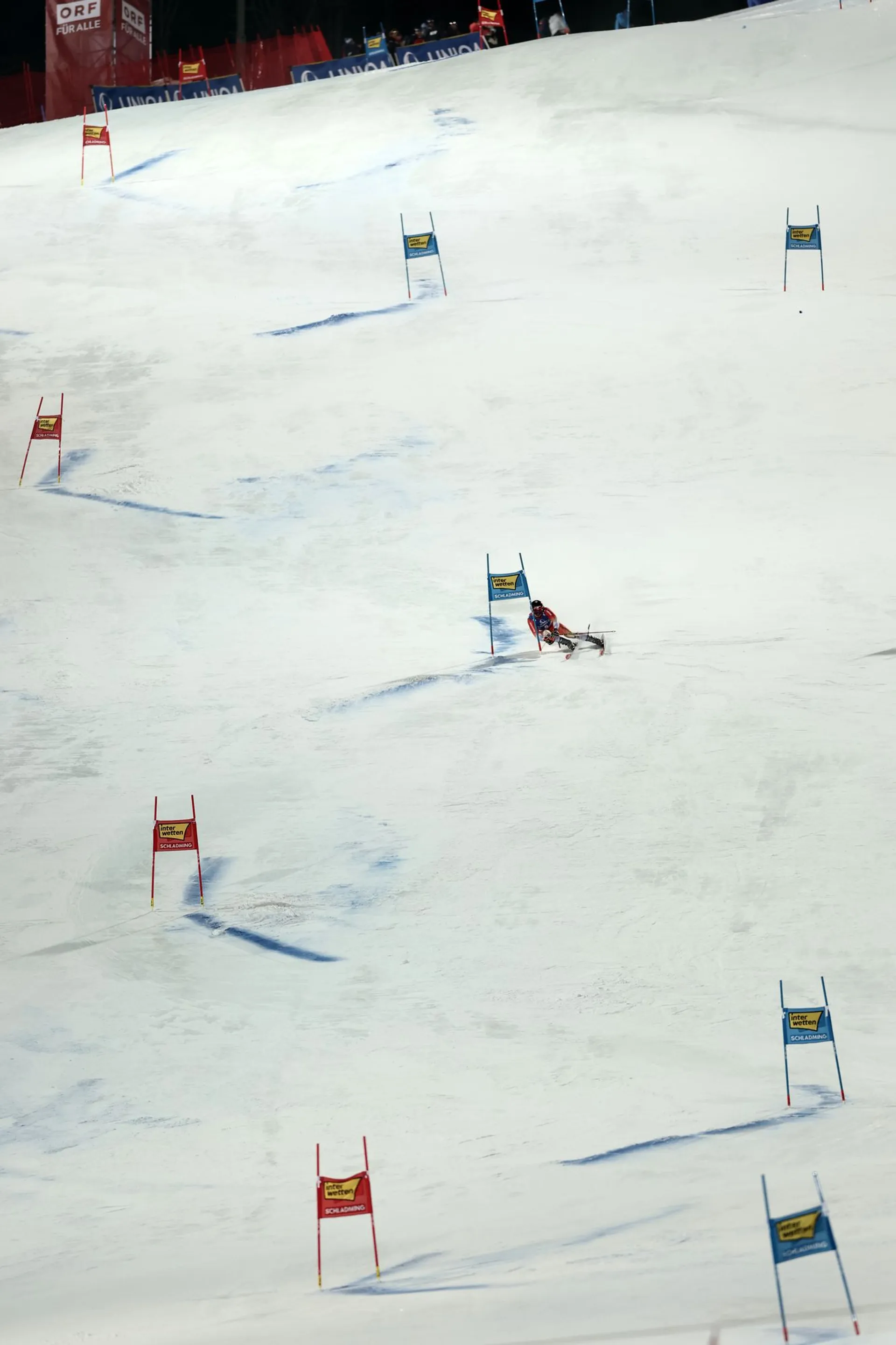 Líder celkového poradia i priebežného hodnotenia disciplíny Marco Odermatt zo Švajčiarska sa na zjazdovke Planai nevyhol v oboch kolách chybám a skončil na štvrtom mieste s mankom 1,26 s na víťaza.