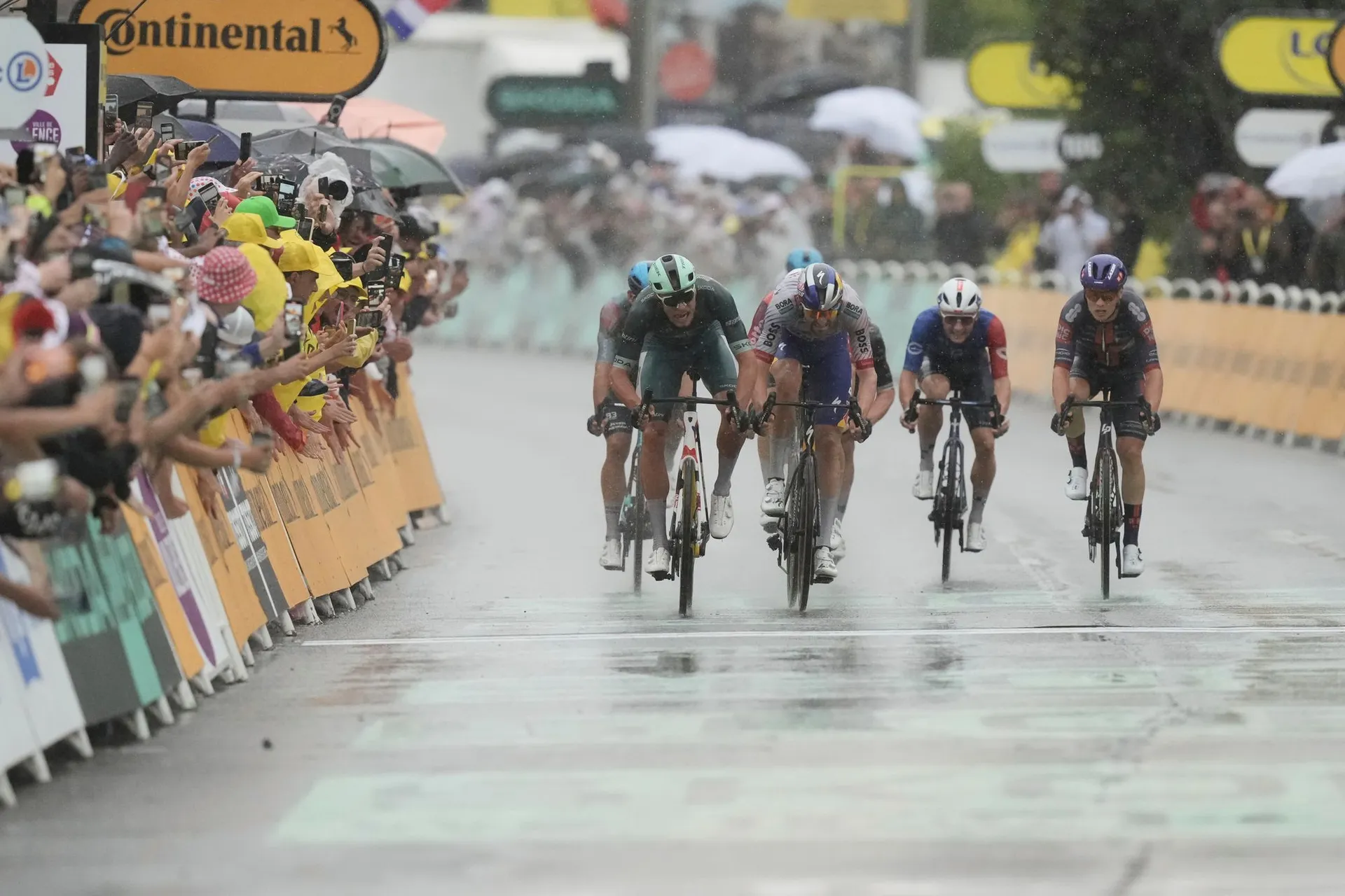 Jonathan Milan, Biniam Girmai i Tem Merlier už mají místečko v přední části pelotonu. Hodně vysoko jede i ve žlutém Tadej Pogačar, který ve sprinterské soutěži nadále drží druhé místo.