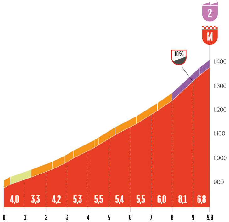 Etapa je takřka rovinatá až do finálního stoupání o délce 9,8 kilometru. Kopec druhé kategorie se před cílem láme do 10 procent.
