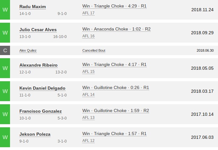 Alvarezových posledných šesť zápasov (Tapology).