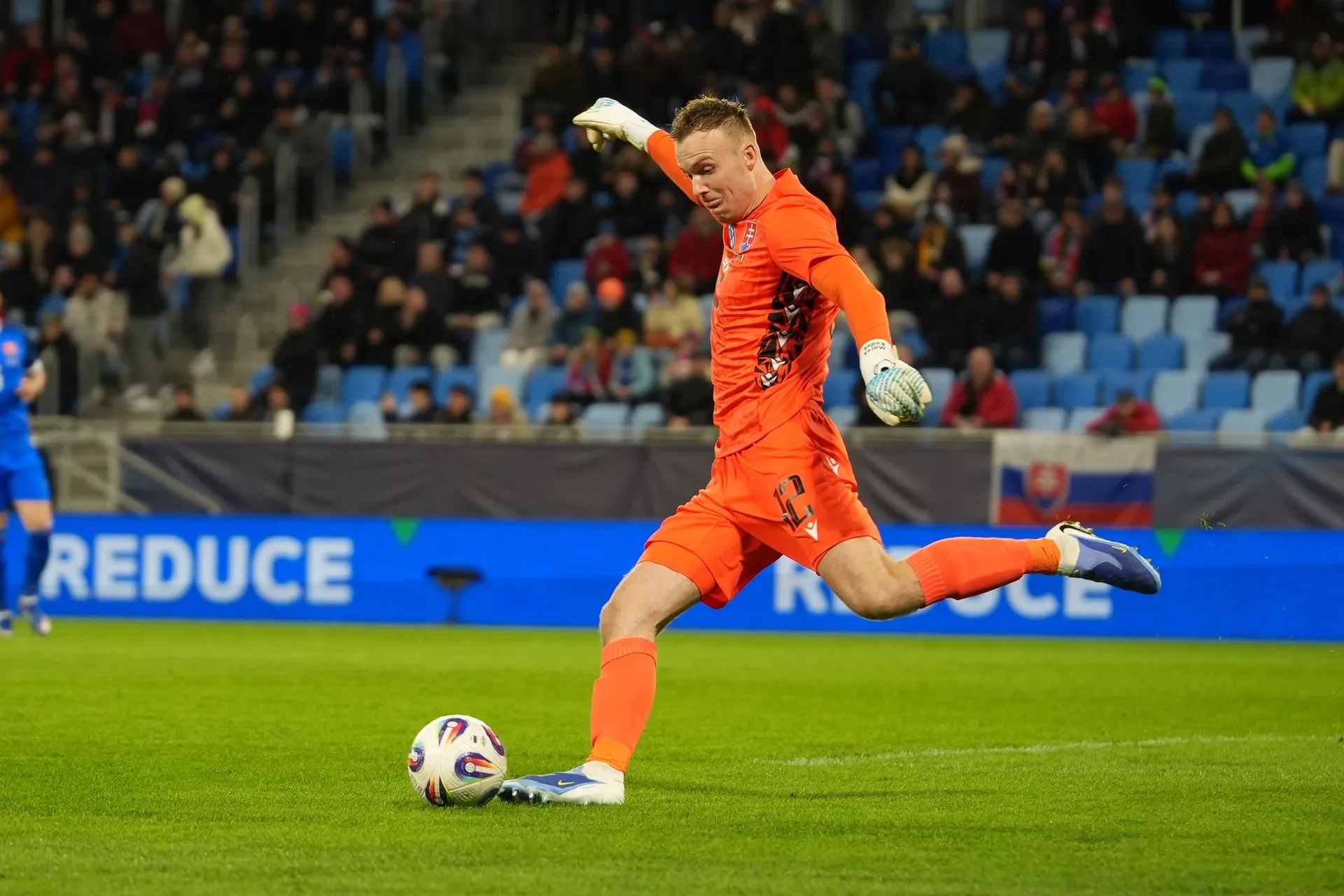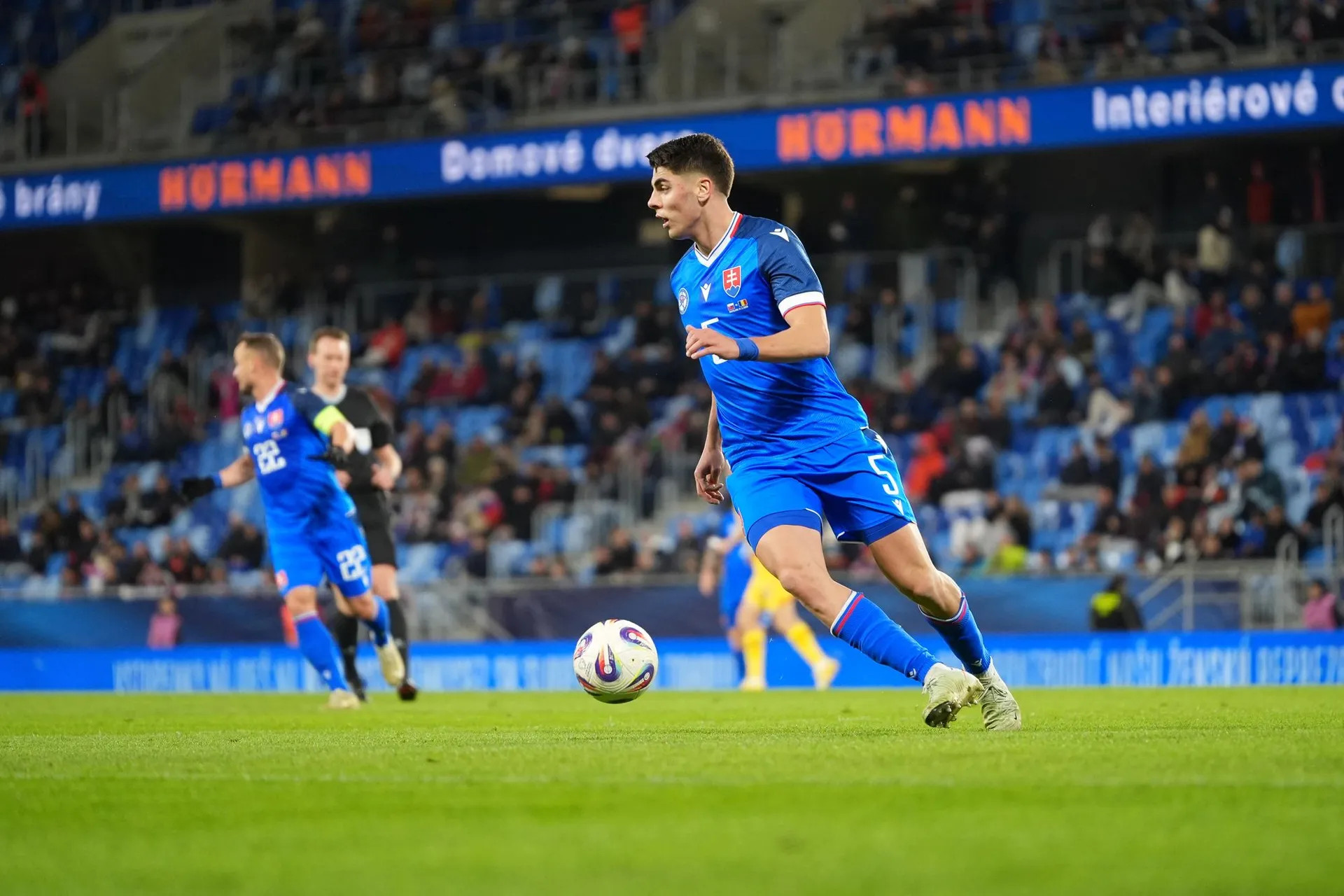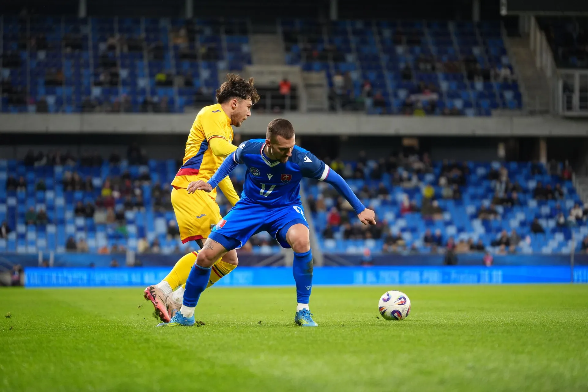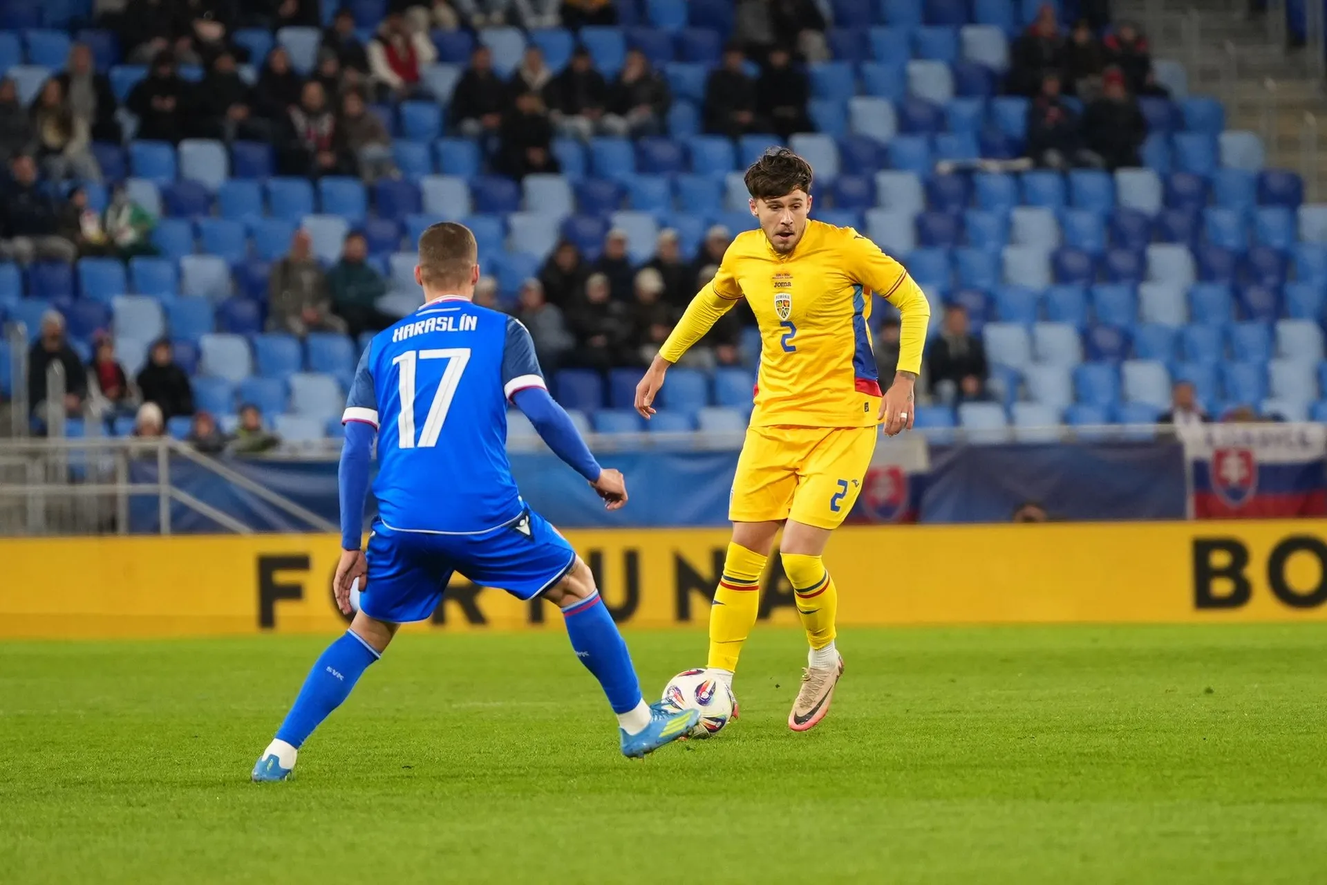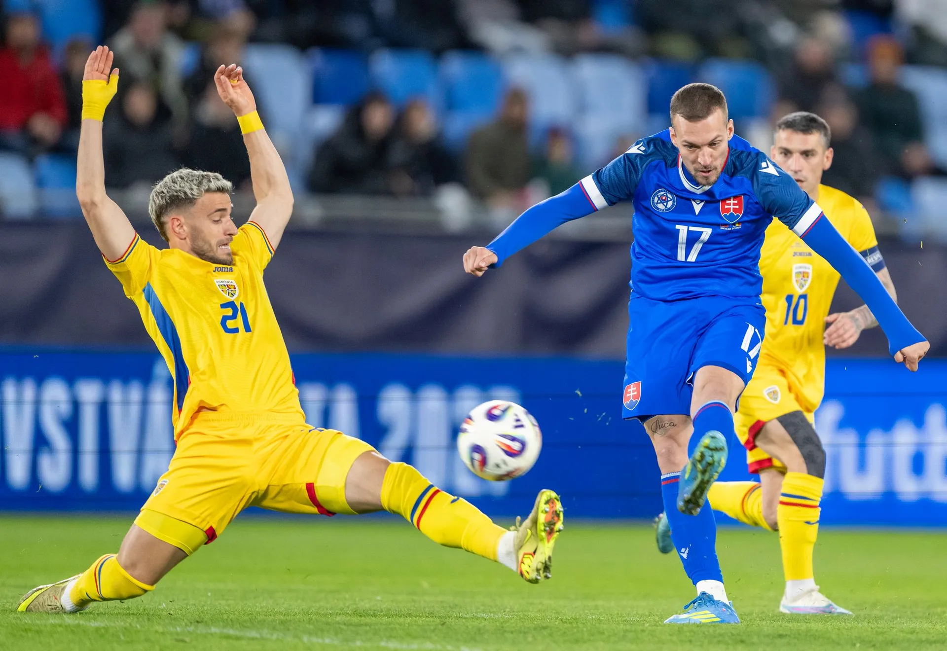 Slováci začali rovnako ako v nevydarenom barážovom dueli proti Kosovu. Na konci šiestej minúty vyslal prvú strelu na bránku hostí Haraslín, ktorého pokus ľavou nohou vyrazil brankár Radu na rohový kop.