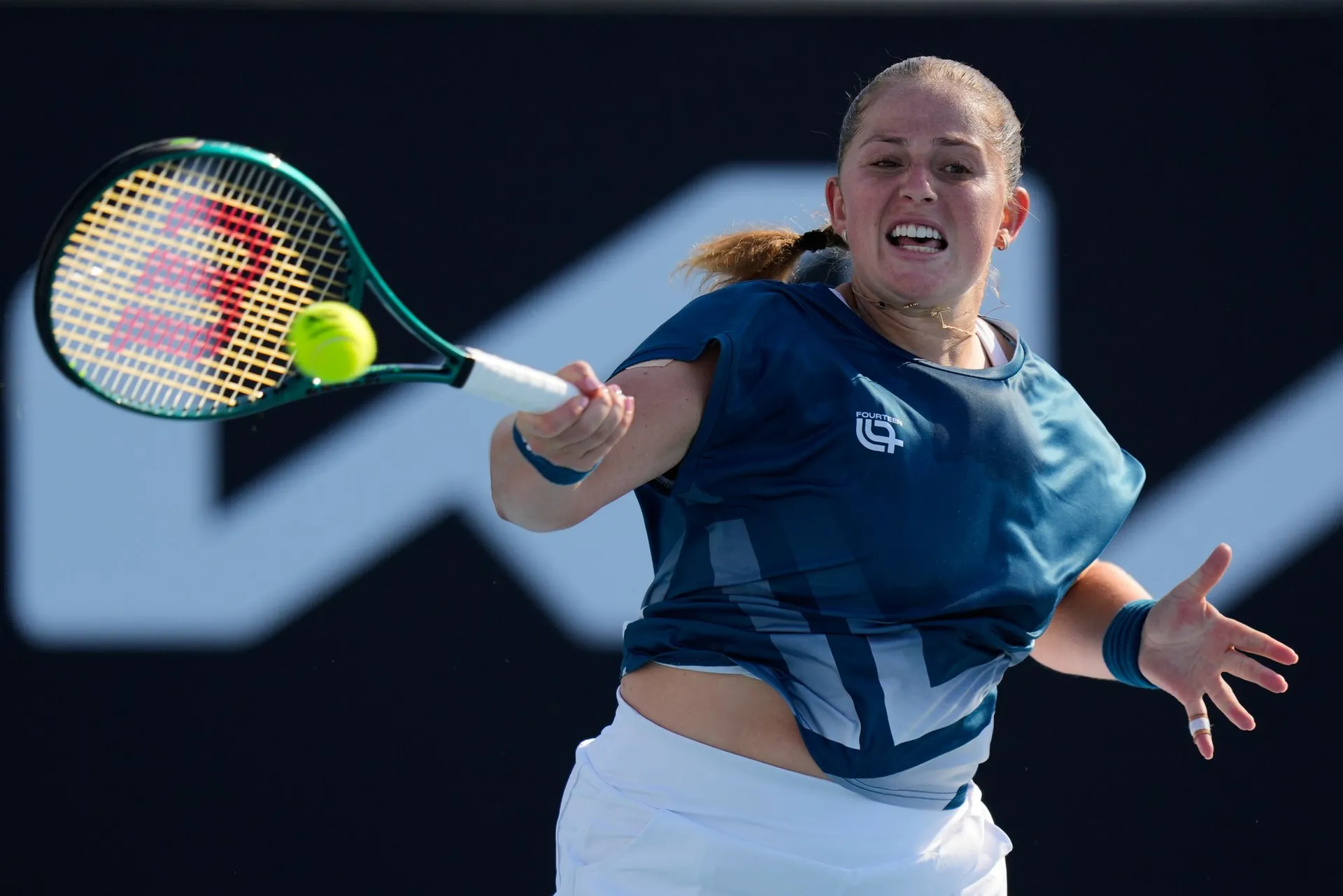 Ostapenková sa snažila zareagovať na servis úderom po ľavej čiare, loptička ale smeruje mimo.