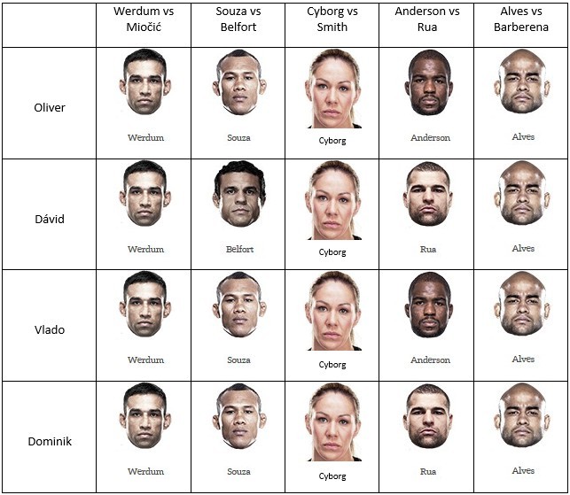 Hlavný zápas večera je medzi Fabríciom “Vai Cavalo” Werdumom (20-5-1 MMA, 8-2 UFC) a Stipe Miočićom (14-2 MMA, 8-2 UFC). Svoje tu určite zohrá aj tlak na jednej strane pre domáceho borca, ktorý pred 45.000 domácimi divákmi “musí vyhrať”. Na druhej strane pre Miočića, na ktorého bude celé publikum kričať “Uh, vai morrer” čo v preklade z portugalčiny znamená zomrieš. Werdum ma najlepšiu zem zo všetkých ťažkých váh a svoj stand up veľmi zlepšil. Miočić nikdy nevyhral zápas na submission, ale ma naozaj perfektný striking a stand up celkovo. Aj keď už Werdum má svoje roky, je šampión a skúsený bojovník, ktorý podľa mňa vyhrá. Dúfam, že po jeho výhre štadión v Curitibe ešte ostane stáť