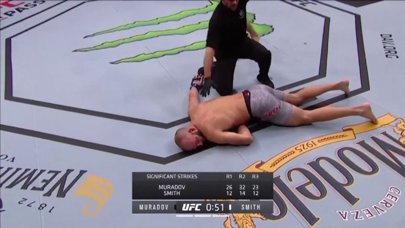 Muradov mal navrch aj v úvodných dvoch kolách. Najmä v 10. minúte súboja nebol veľmi ďaleko od ukončenia zápasu submisiou, no Smitha zachránil koniec druhého kola.